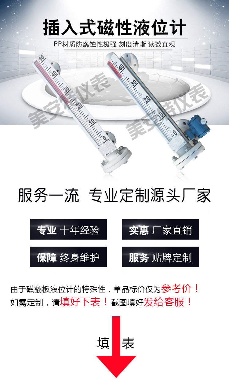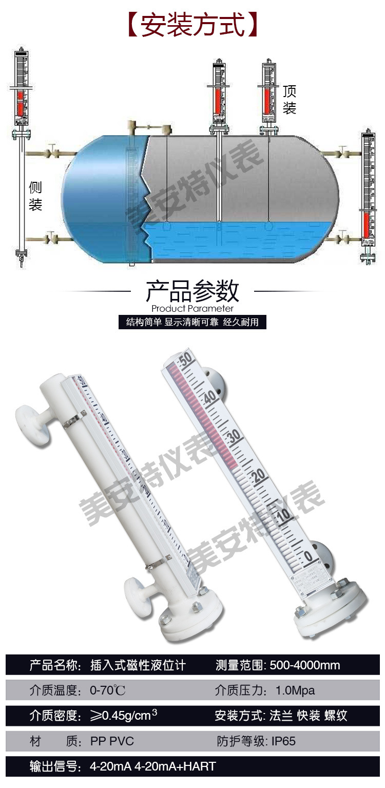 插入式磁性液位计(电流型)吸收同类产品,并加以吸收、消化、提高,按原化学工业 部颁布的磁性液位计标准HG/T21584-95研制生产的产品。可用于各种塔、罐槽、球形容器和锅炉等设备的介质液位检测。该系列磁性液位计可以做到高密封,防泄漏和适应高压高温、腐蚀性条件下的液位测量,具有可靠的安全性,它弥补了玻璃板(管)液位计指示不清晰,易破碎的不足,不受高、低温度剧变的影响,不需多组液位计的组合。全过程测量无盲区,显示醒目、读数直观,且测量范围大。特别是现场指示部分,由于不与液体介质直接接触,所以对高温、高压、高粘度、有毒有害、强腐蚀性介质,更显其优越性。因此,它比传统的玻璃管,板式液位计具有更高的可靠性、安全性、先进性、实用性。