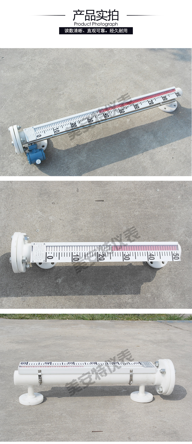 zui显著特点是液体介质与指示器完全隔离,所以在任何情况下都非常安全、可靠、耐用,而且各种型号的液位计配上液位报警、控制开关,可实现液位或界位的上、下限越位报警,控制或连锁;配上静压式液位变送器或干簧-电阻式液位变送器,可将液位,界位信号转换成二线制4-20mADC标准信号,实现远距离指示、检测、记录与控制。该系列磁翻板液位计可广泛适用于电力、石油、化工冶金环保、船舶、建筑、食品等各行业生产过程中的液位测量与控制。